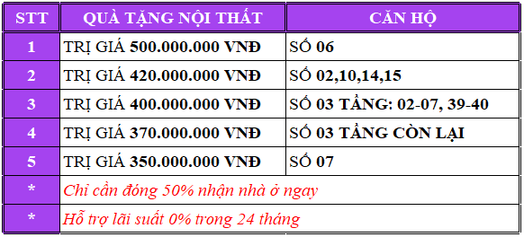 - Chính sách ưu đãi: Hỗ trợ 0% lãi suất đến 24 tháng. Thanh toán 50% nhận nhà